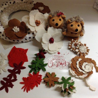 Rengeteg virágot vágtunk ki filcből…szeretjük a gombokat, szalagokat, csipkéket….